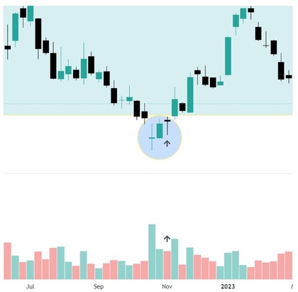 El precio siguió bajando hasta que apareció volumen. El precio tiene inercia; si está bajando, lo normal es que siga bajando hasta que aparezca un volumen extraordinario que pare la caída. Este volumen SOLO lo puede realizar el dinero profesional.